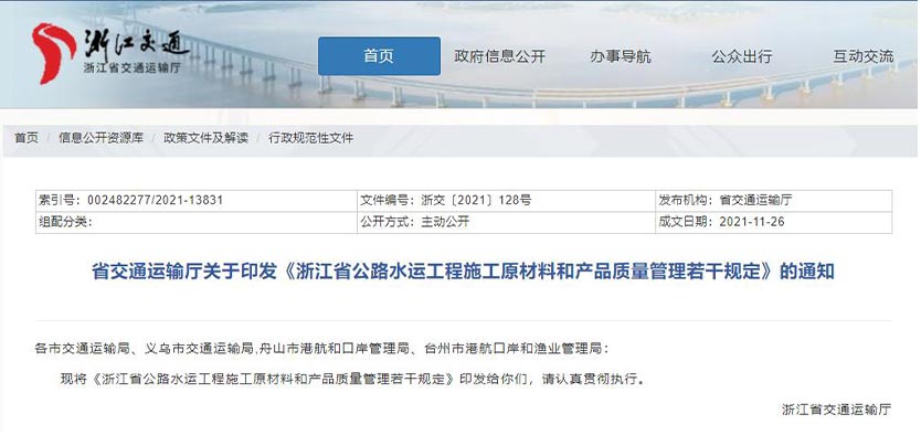 近日,浙江省交通運輸廳制定出臺《浙江省公路水運工程施工原材料和產品質量管理若干規(guī)定》(以下簡稱《若干規(guī)定》)。